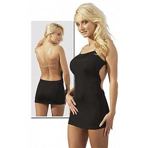 • Описание: Тонкое облегающее мини-платье стреч с открытой спиной. На трех прозрачных силиконовых ленточках, перекрещивающихся на спине, спереди украшенных стразами. Цвет черный. Состав: 95% Полиэстер, 5% Эластан. Размер S/M